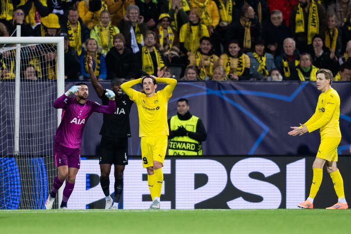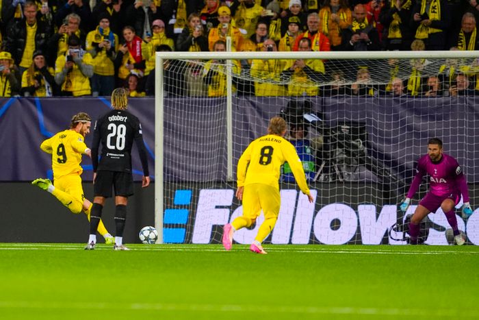 Tottenham header i stolpen! Flaksen er med Glimt. Odobert får heade nokså fritt i duell med Sjøvold. Fra få meter går ballen i stanga!