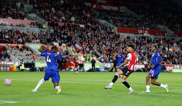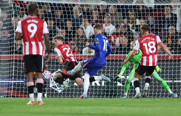 Palmer prøver å skyte fra langt hold på det frisparket. Går rett i muren. Han får ballen tilbake. Han skyter på nytt - også den avslutningen rett i en Brentford-forsvarer.