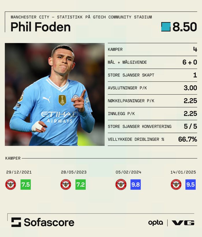 Phil Foden har spilt fire kamper på Gtech - og tallene hans er enorme. Kjelde: Sofascore.