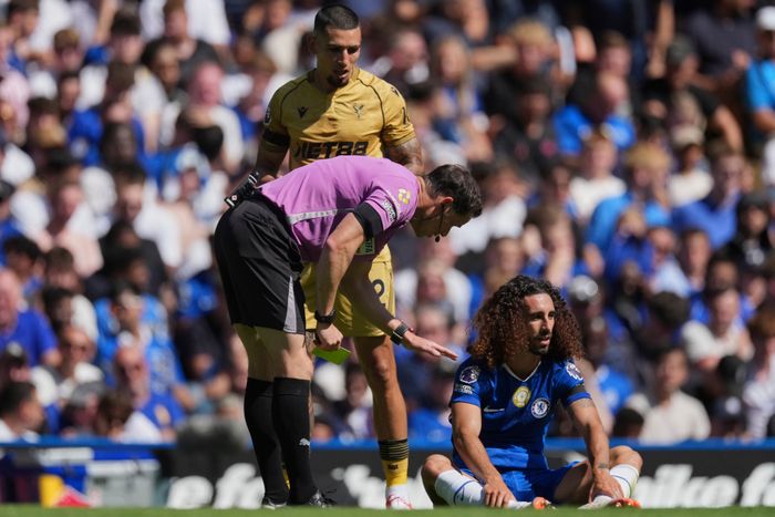 Skrur inn på første. Stusses videre av Cucurella, får en "ekkel" dupp for Palace. Sarr redder på strek.