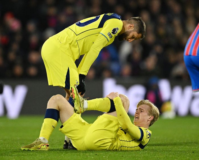 Bergvall ligger nede. Holder seg til lysken og får tilsyn på banen.