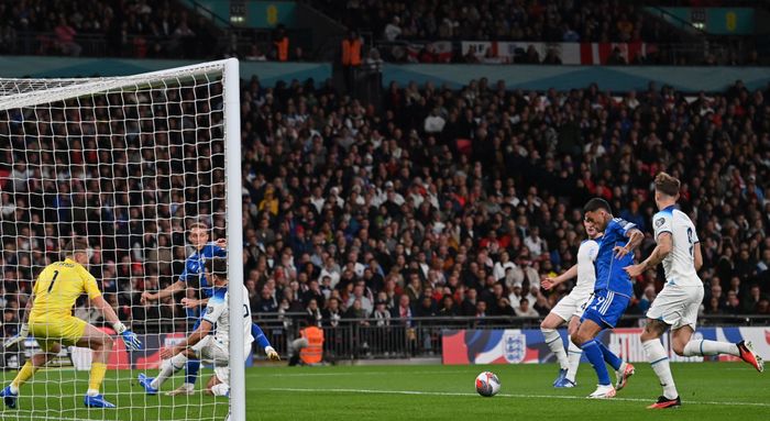 DER SITTER DEN FOR ITALIA! Gjestene ruller opp på Englands halvdel. Di Lorenzo stikkes fri nede til høyre, før han slår lavt inn foran mål. Der står Scamacca, og umarkert banker spissen inn 1-0 til Italia! Foto: AFP.