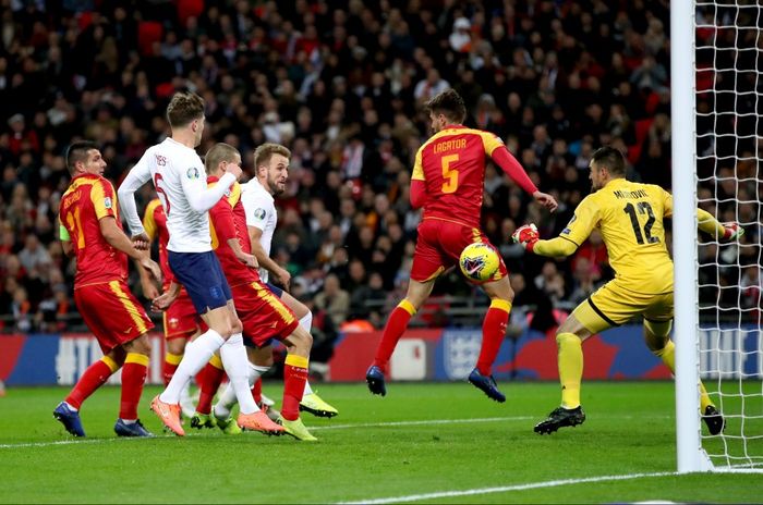 SÅ SITTER DEN TREDJE! Og igjen er det Harry Kane! Og ikke nok med det, igjen er det Chilwell med den målgivende pasningen. Strålende corner fra Chilwell, svakt markeringsspill fra Montenegro og et kontakt hodestøt fra Kane betyr 3-0 og cruisekontroll for England. Foto: PA Photos.