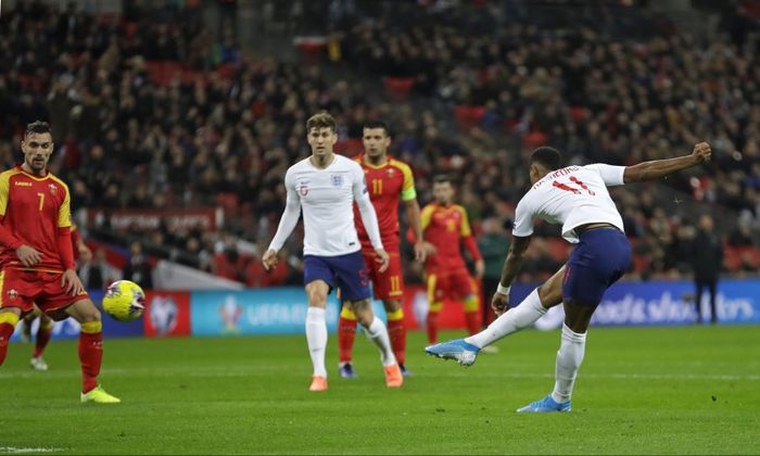 NESTEN - IGJEN! Marcus Rashford setter fart og ingen Montenegro-spillere henger med. Avslutningen fra skrått hold reddes imidlertid av Mijatovic. Corner for England.