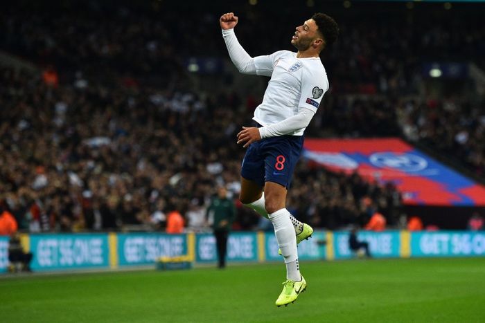 SÅ SITTER DEN! Oxlade-Chamberlain hamrer inn sitt syvende landslagsmål! Vakker crosser fra Chilwell, perfekt førstetouch fra Oxlade-Chamberlain som banker til og limer ballen i det lengste hjørnet. Flott England-scoring! Foto: AFP.