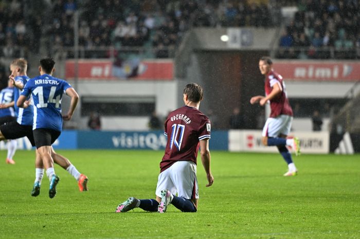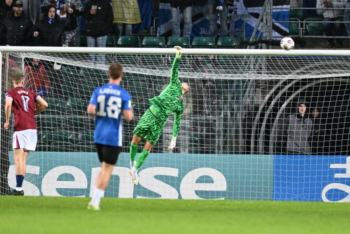 Ajer sklir når han skal slå en lang ball mot Sørloth. Femmeter for Estland.