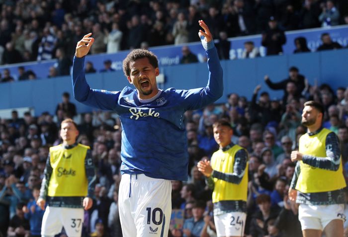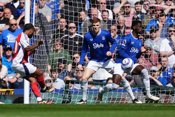 For en redning av Pickford! Trossard banker til, men Pickford er der og redder ballen - som også har skru. Men så blåses det uansett frispark.