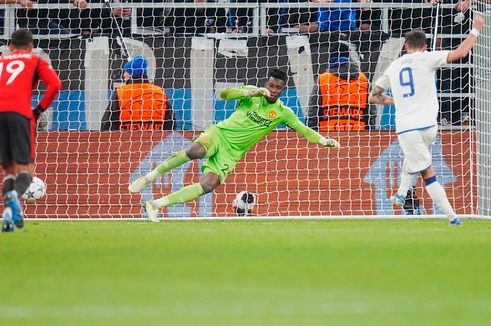 Rasmus Falk kommer til skudd fra 18 meter, men den blir ganske grei for Onana.