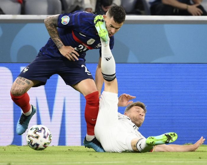 Voldsom duell mellom Kimmich og Hernandez. Sistnevnte blir liggende. Får et spark i ansiktet fra Kimmich, men det var uforskyldt. Foto: AP.