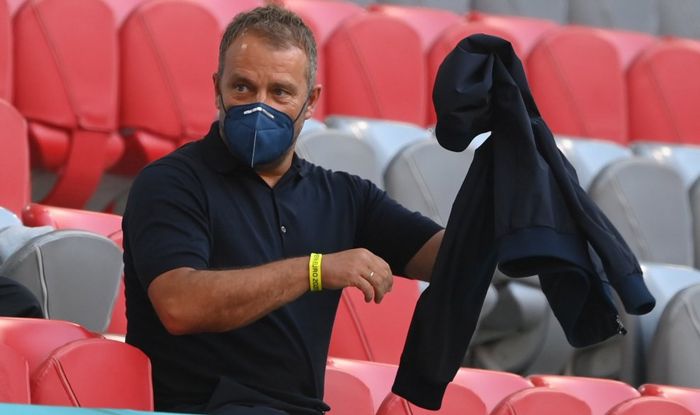 Tysklands Joachim Löw tar på sin side fatt på sitt siste mesterskap som trener for Die Mannschaft. Trenerveteranen gir seg etter sommerens EM. På tribunen i dag sitter hans etterfølger, Hansi Flick. Foto: Reuters.