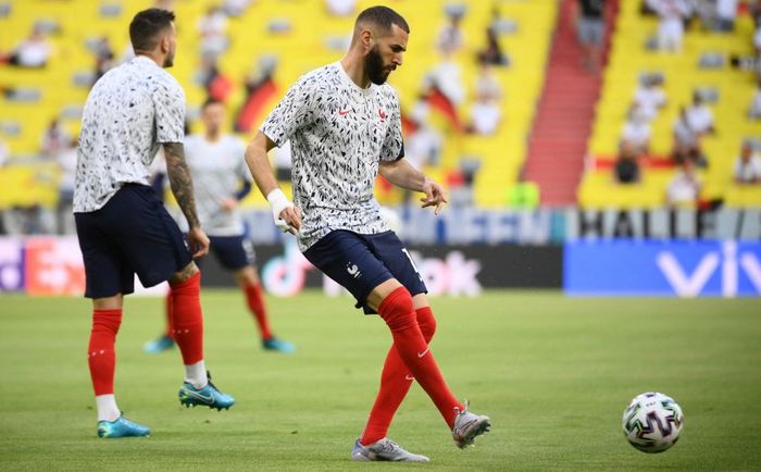 Karim Benzema ble altså klar for Frankrike etter at han skadet seg i oppkjøringen. Han starter sammen med Kylian Mbappé på topp. Foto: AFP.