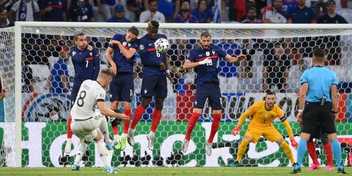 Så handser Rabiot like utenfor egen boks. Frispark i god posisjon for Tyskland.