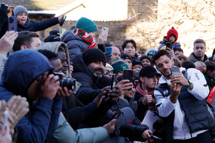 Raul Jimenez tar noen selfies med fansen ved ankomst til Craven Cottage. Foto: Andrew Couldridge / Reuters / NTB