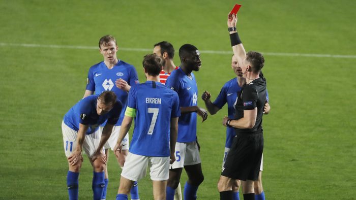 Ellingsen med en fryktelig sen takling på Puertas. Det andre gule kortet på to minutter – da er det rett i dusjen for Molde-spilleren.