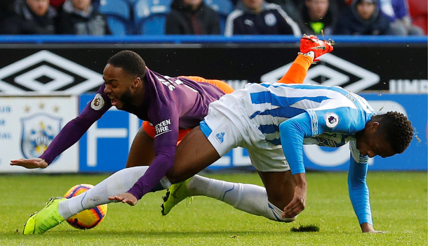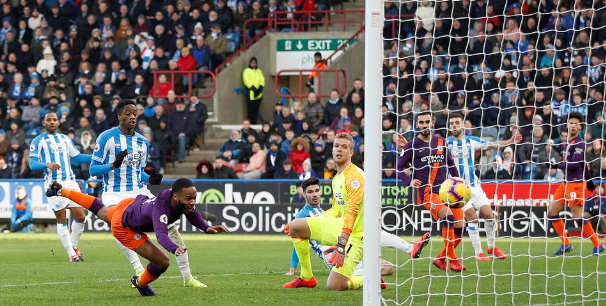De Bruyne stikker nydelig frem til Sterling som styrter inn i feltet. Han stoppes kontant av Kongolo, men City får ikke straffe. Reprisene viser at Huddersfield var meget heldige der... Foto: REUTERS.