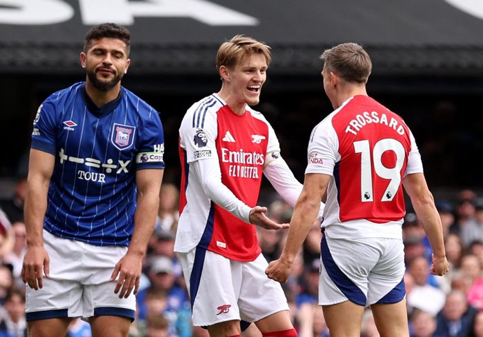Trossard klarer på utrolig vis å beholde ballen utenfor 16-meteren i duelle med to-tre Ipswich-spillere før han slår en nydelig stikker mot Martinelli. Brasilianeren forstyrres såpass mye av Tuanzebe at det ender med utspark for hjemmelaget.