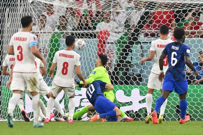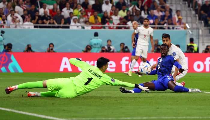 Brukbar sjanse for USA. Dest slår inn, og Alireza Beiranvand havner på halvdistanse. Får avverget innlegget, og slår ballen ut langs bakken.