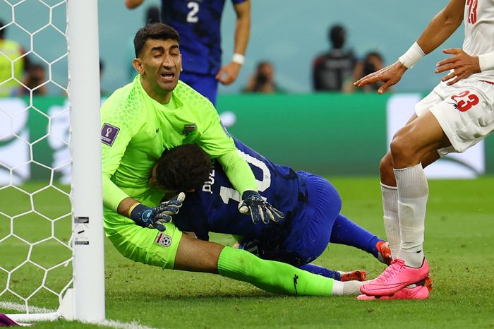 Får seg en trøkk i duell med Beiranvand idet han scorer, Pulisic.