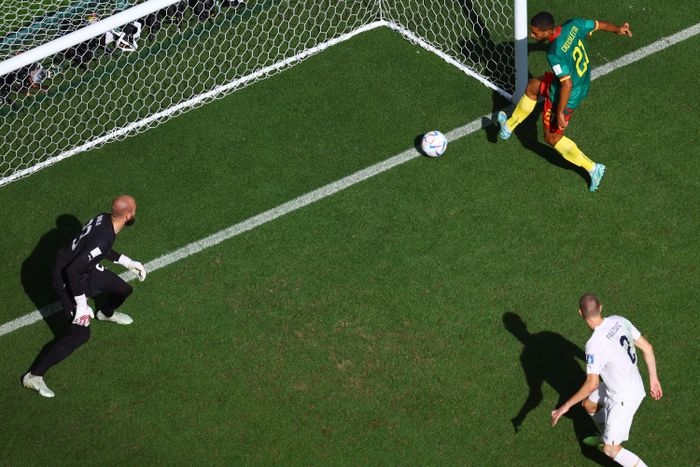 Kamerun setter inn et høyt press og Ekambi vinner ballen, men Serbia henter seg inn igjen.