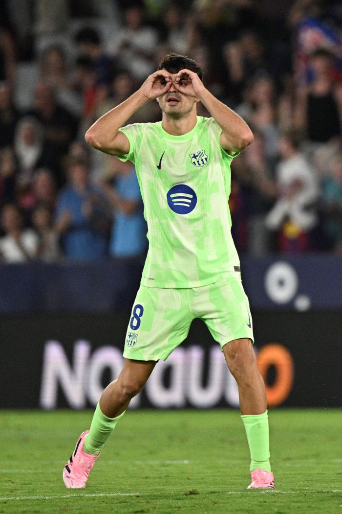 Pedri drar enkelt av to Levante-spillere med en såledragning før han skyter fra 20 meter. Rett på Cunat.