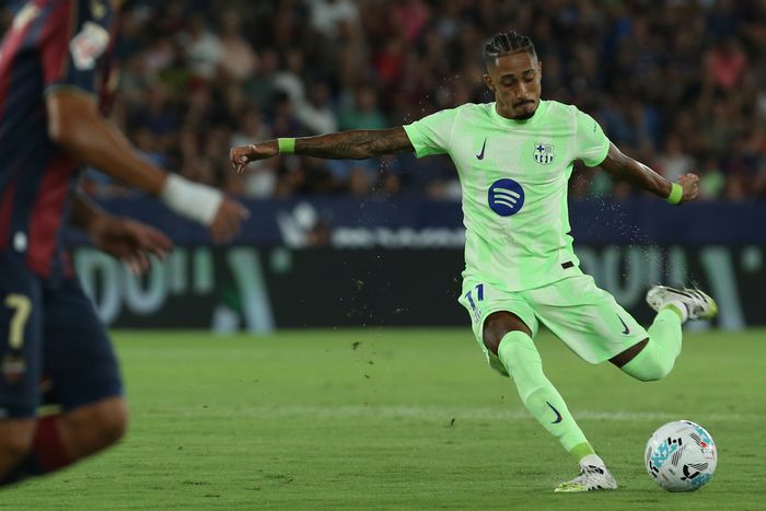 Raphinha skjærer innover og slipper til Balde. Han smeller til, via et Levante-bein og ut til hjørnespark. Der var Cunat utspilt.