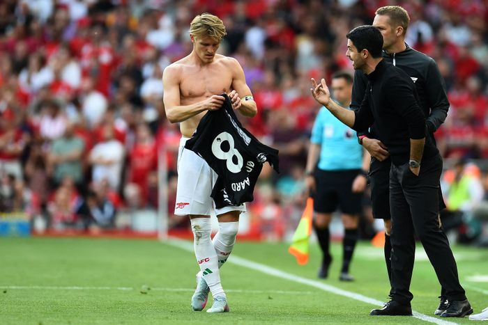 Ødegaard har fått seg en ny drakt. Ble noen minutter med opprevet trøye før han fikk anledning til å bytte.