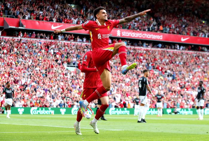DE KJØRER PÅ! Liverpool vinner ballen på midtbanen og Salah slår en strålende pasning i bakrom til Szoboszlai. Ungaren er uselvisk når han spiller til venstre og da kan Diaz spasere inn 2-0 på åpent mål.