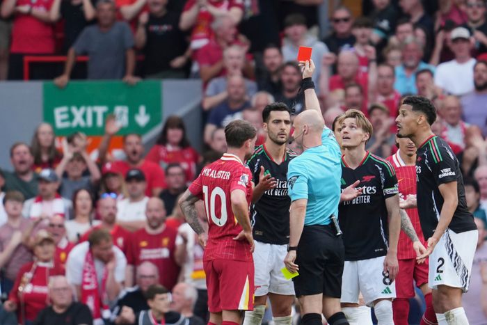 Arsenal blir redusert til ti mann! Dårlig igangsetting av Raya, og dårlig mottak av Merino. Merino prøver å rette opp egen feil, og feller Szoboszlai rett utenfor 16-meteren. Får sitt andre gule kort for dagen, og dermed rødt.