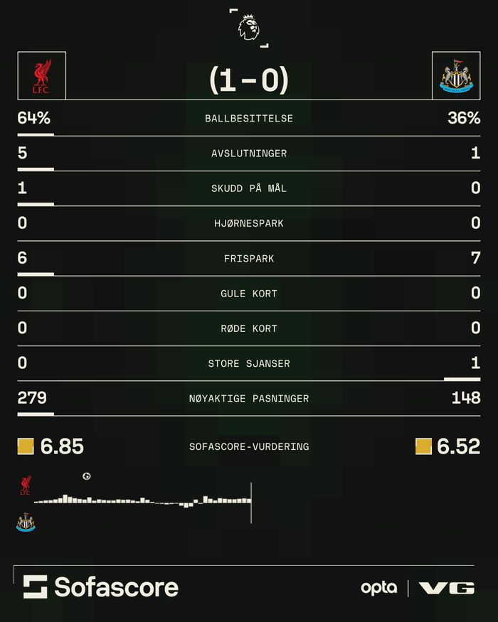 Kampen er slutt og Liverpool slår Newcastle 2-0! Arne Slot kan dermed juble for tre nye poeng fra tribunen. Liverpool fikk scoringene de trengte fra Dominik Szoboszlai og Alexis Mac Allister. Med en kamp mer spilt er Liverpool dermed 13 (!) poeng foran Arsenal, ettersom London-laget spilte uavgjort mot Nottingham Forest. Newcastle blir værende på 6. plass. Takk for følget!