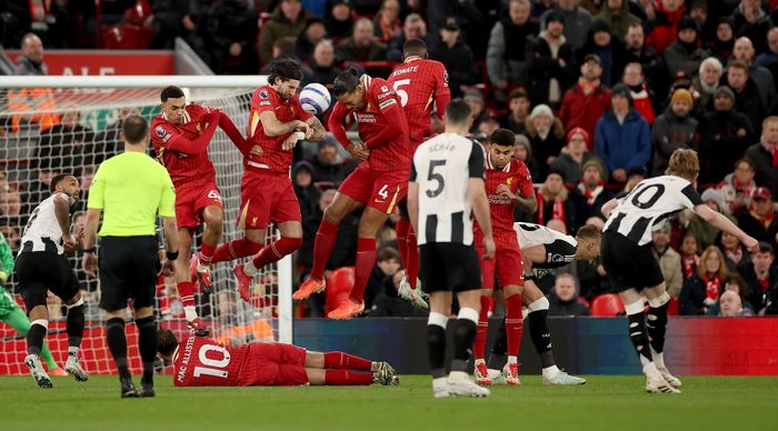 Alexander-Arnold blokkerer et innlegg fra Gordon. Hjørnespark til bortelaget.