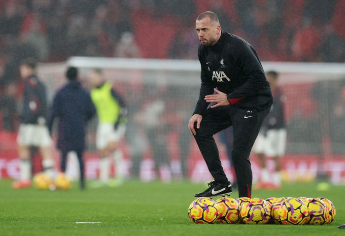 Tidligere Everton-spiller John Heitinga leder Liverpool i dag. Heitinga ble assistenttrener under Slot i juli. Her fra kampen mot United i starten av januar.