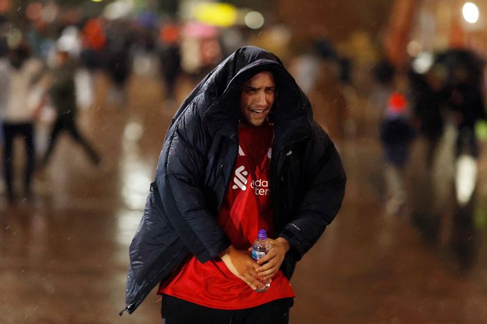 Det blir sklitaklinger i kveld. Regnet øser ned i Liverpool.