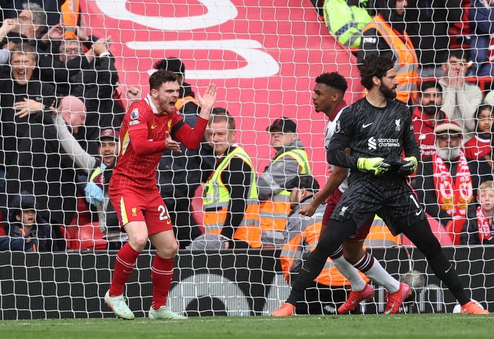Robertson blir liggende etter å ha fått seg en smell. Han får faktisk kneet/foten til lagkamerat van Dijk i halsen når begge går i samme duell mot Füllkrug.