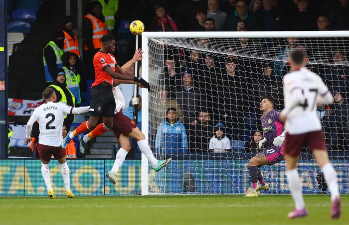 Luton kombinerer seg inn i Citys straffefelt. Bortlaget får klarert.