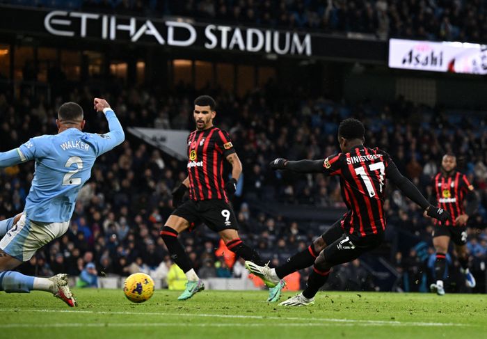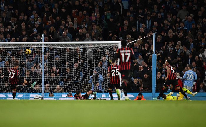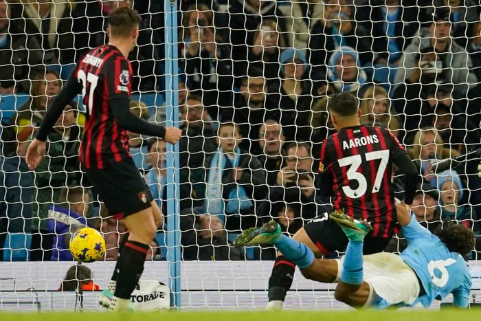 Stor Haaland-sjanse! Alvarez slår et nydelig innlegg på bakerste mot Haaland. Spissen header via en Bournemouth-spiller i stolpen! Foto: AFP