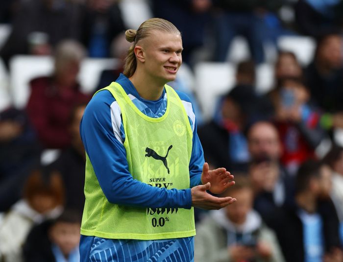 Haaland byttes ut! Nordmannen får ikke fortsette i andre omgang. Så ut til å halte litt på overtiden av første omgang. Det er fjerde gang han byttes ut for City denne sesongen. Foto: Pa Photos