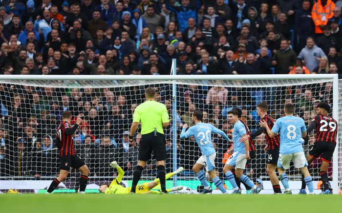 Doku fortsetter å herje. Ser etter Alvarez foran mål, men Bournemouth-forsvaret får skjermet ballen til keeper Radu.