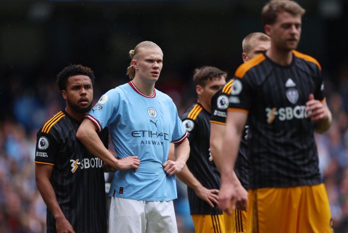 Foden forsøker å sparke ballen i en Leeds-spiller, men bommer. Da får bortelaget en overgangsmulighet, men den renner ut i sanden etter en upresis langpasning.
