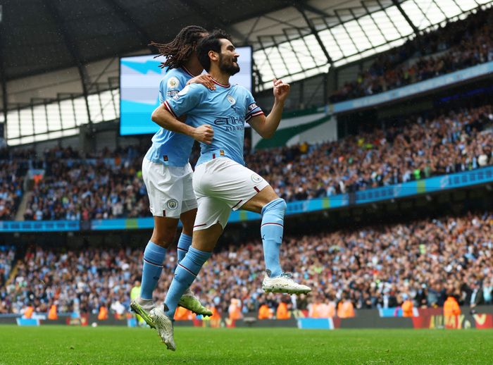 Gundogan slår langt mot Haaland. Det ender med et kast til City.