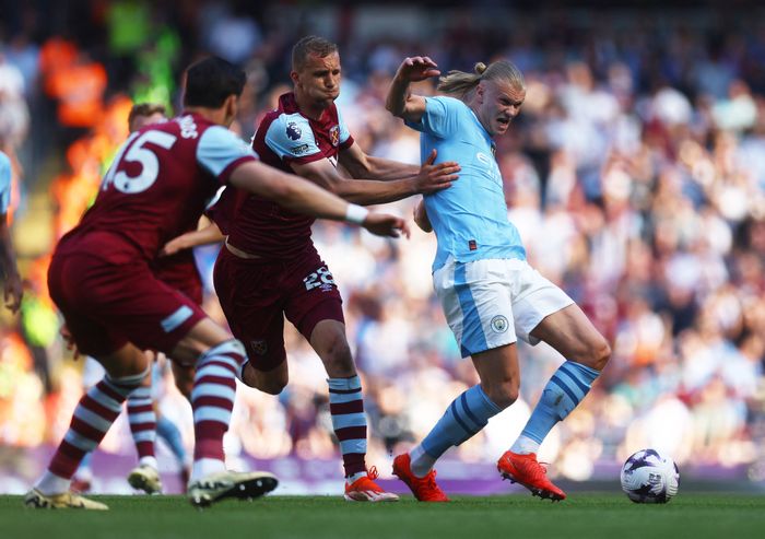 Foden slår bort ballen, men Antonio har ingen med seg i kontringen og må rygge. Ender med at Haaland lager frispark mot midtstopper Mavropanos.