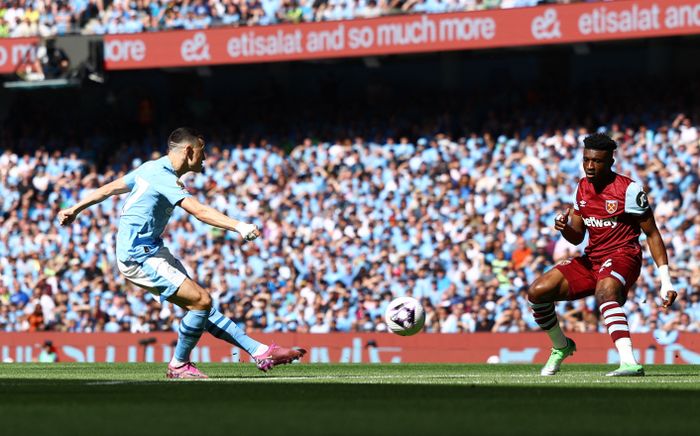 Foden får frispark like utenfor de venstre hjørnet av 16-meteren til West Ham. Innbytter Alvarez som feller engelskmannen etter noen sekunder på banen.