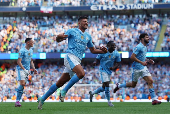 RODRI GJØR AT CITY FESTER GREPET! Etter en lang periode med balltrilling utenfor 16-meteren til City spiller Bernardo ut til Rodri. Han skyter hardt langs bakken og ned til høyre. Areola får en hånd på den, men ikke nok til å stoppe 3-1 for City.