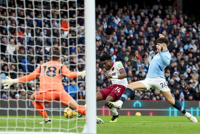 Enorm mulighet for West Ham. Kudus kommer til skudd fra skrått hold. Manchester City skal være lykkelig for at ballen går i nettveggen.
