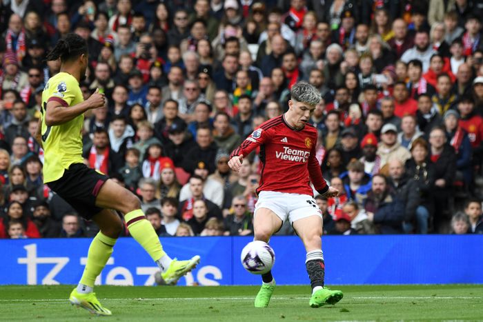 Garnacho får skikkelig klem i et skudd inne i sekstenmeteren. Dessverre for United går det rett på keeper.