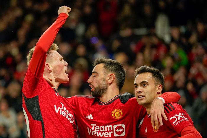 Scott McTominay og Antony jubler over scoring. Foto: Reuters