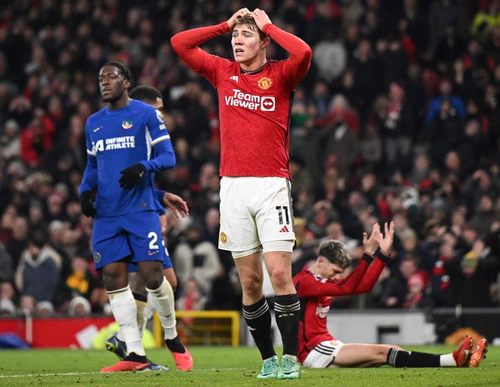 Garnacho er såååå nær å gi 3-1. Innlegget fra Reguilon blir satt rett utenfor bortre stolpe.