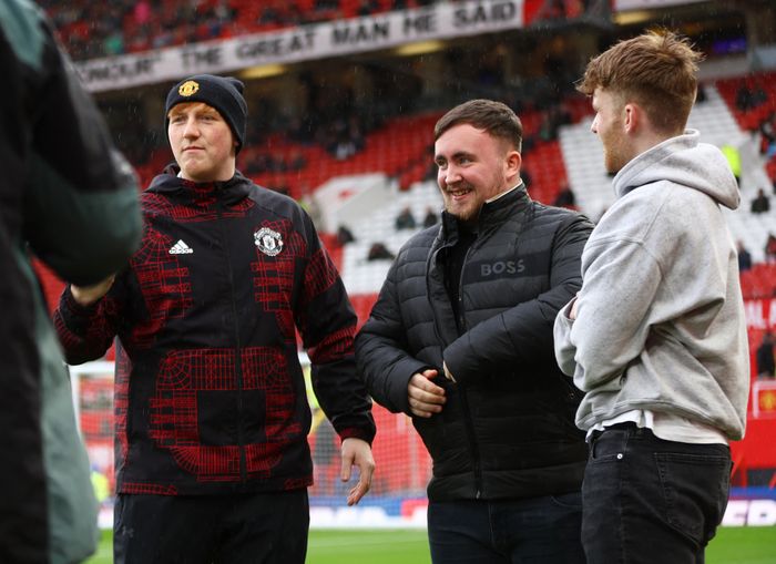 Dart-sensasjon og United-supporter Luke Littler er på plass (i midten)!