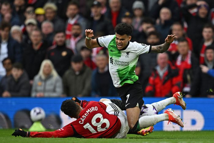 Casemiro sparker ned Luis Diaz og får gult kort. Foto: AFP
