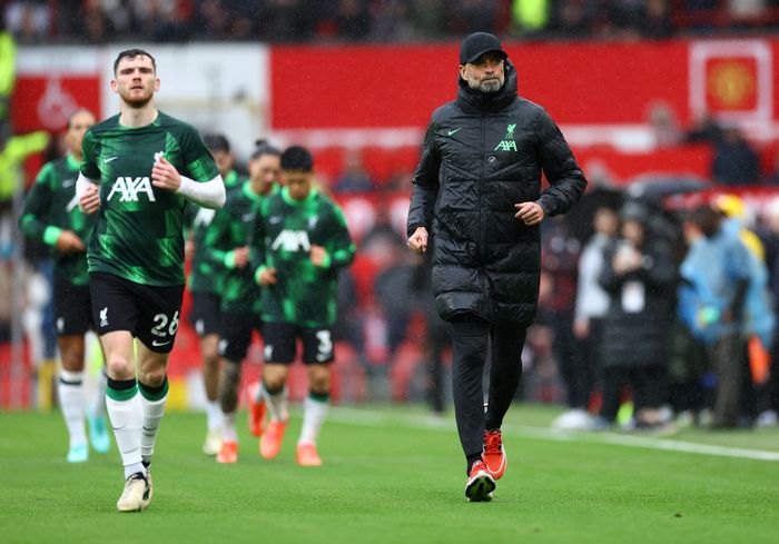 Andy Robertson og manager Jürgen Klopp på oppvarmingen. Foto: Reuters
