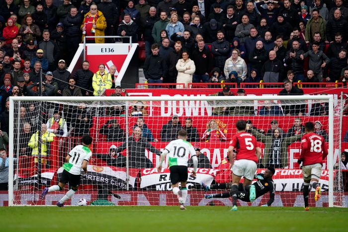 Salah skyter i det ene hjørnet, Onana går til det andre. Salah scorer alltid mot United.